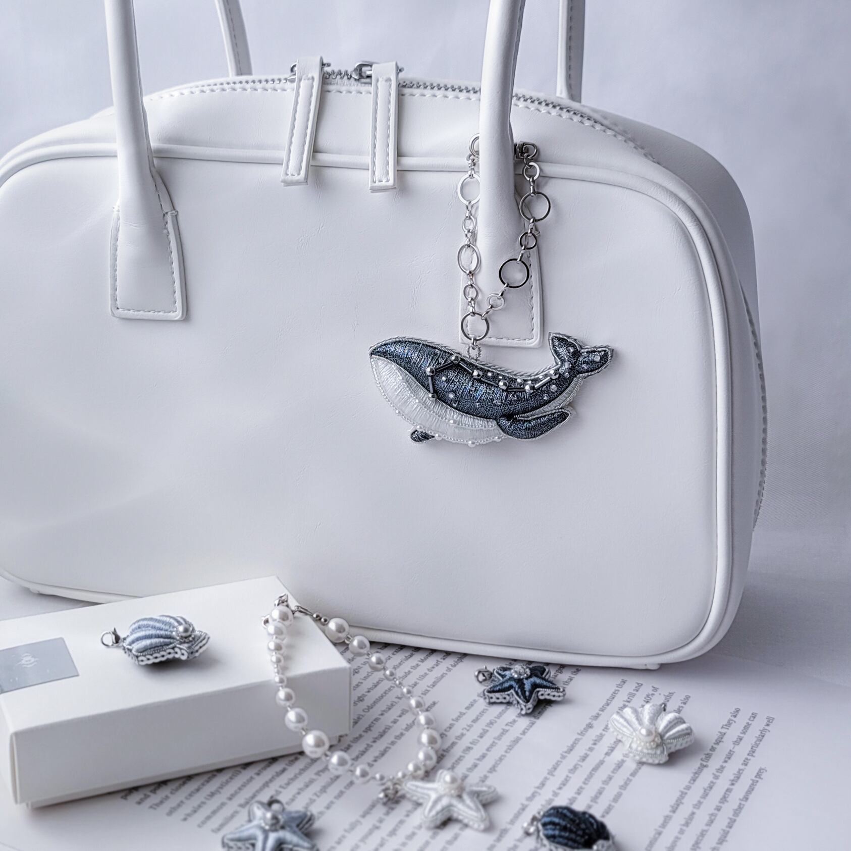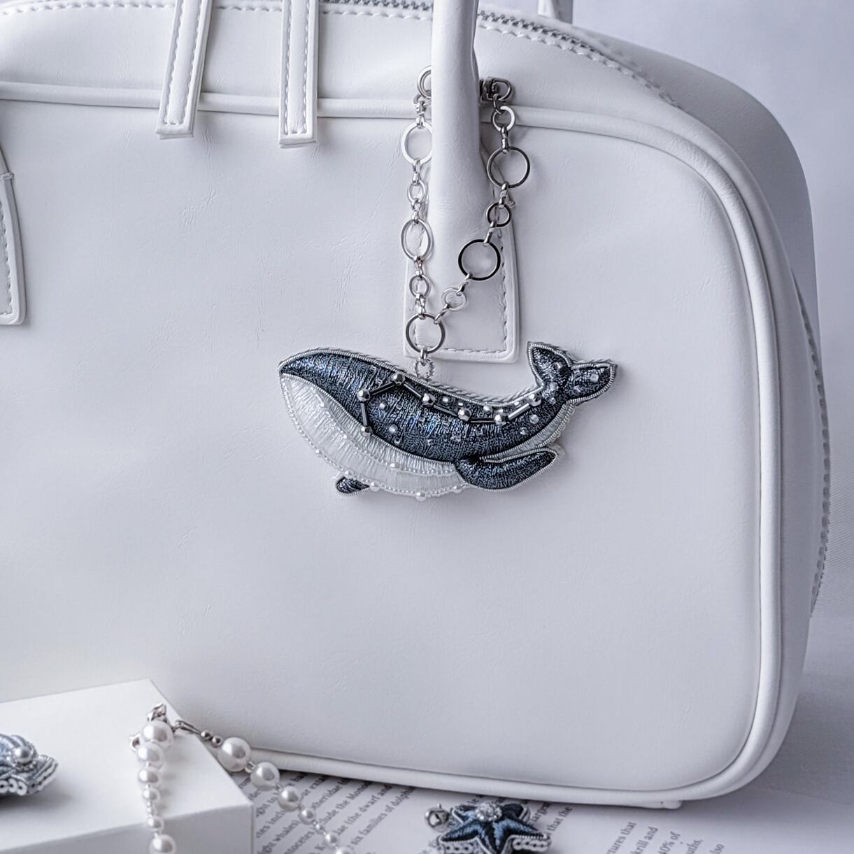 シルバービーズとグレーに近いブルーの刺繍糸を使用し、男女問わず、シックな装いにも合うよう仕立て上げました。