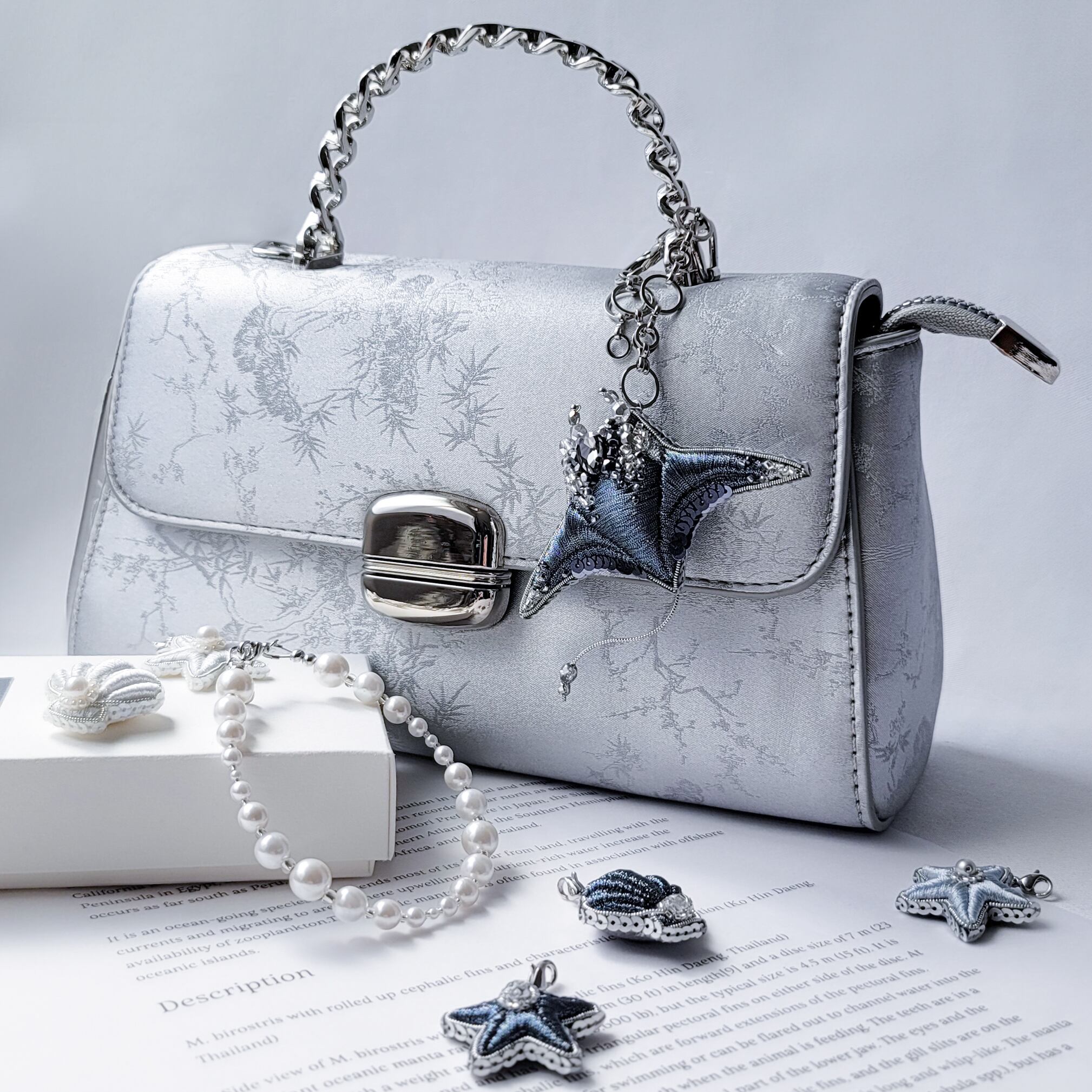 光沢のあるメタリックな糸に星のようなキラキラしたシルバーのビーズをグラデーションのように配置し、
